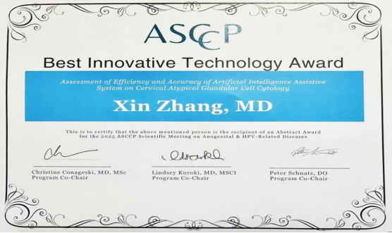 以党建赋能科研攻关,推动AI病理诊断技术突破与临床转化,实现党建与学科发展双融双促。近年来,在支部书记、学科带头人曾宪旭教授的带领下,学科建设取得了一系列令人瞩目的成果。科室先后获批国际远程病理会诊中心、宫颈癌防控技术培训基地、郑州市妇科疾病早期诊断重点实验室等资质,并于2023年通过ISO15189医学实验室国际认证,成为全国妇幼系统首家、河南省第三家获此殊荣的病理科。2024 年首创的 AICyte 宫颈细胞学辅助系统亮相 USCAP 年会壁报展示,并荣登《现代病理学》期刊;同年携手清华大学发布的 GTDoctor 病理大模型,实现了滋养细胞疾病诊断 97.7% 的正确率,100% 的特异度,96.3% 的敏感度,达到国内领先、国际先进水平。2025年,病理科科研团队主导的研究成果《人工智能辅助系统在宫颈非典型腺细胞学中的效能验证研究》荣获美国阴道镜及宫颈病理学会(ASCCP)科技创新奖,为医疗资源欠发达地区的宫颈癌防控提供了精准高效的解决方案。