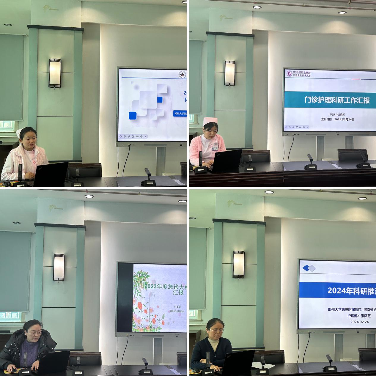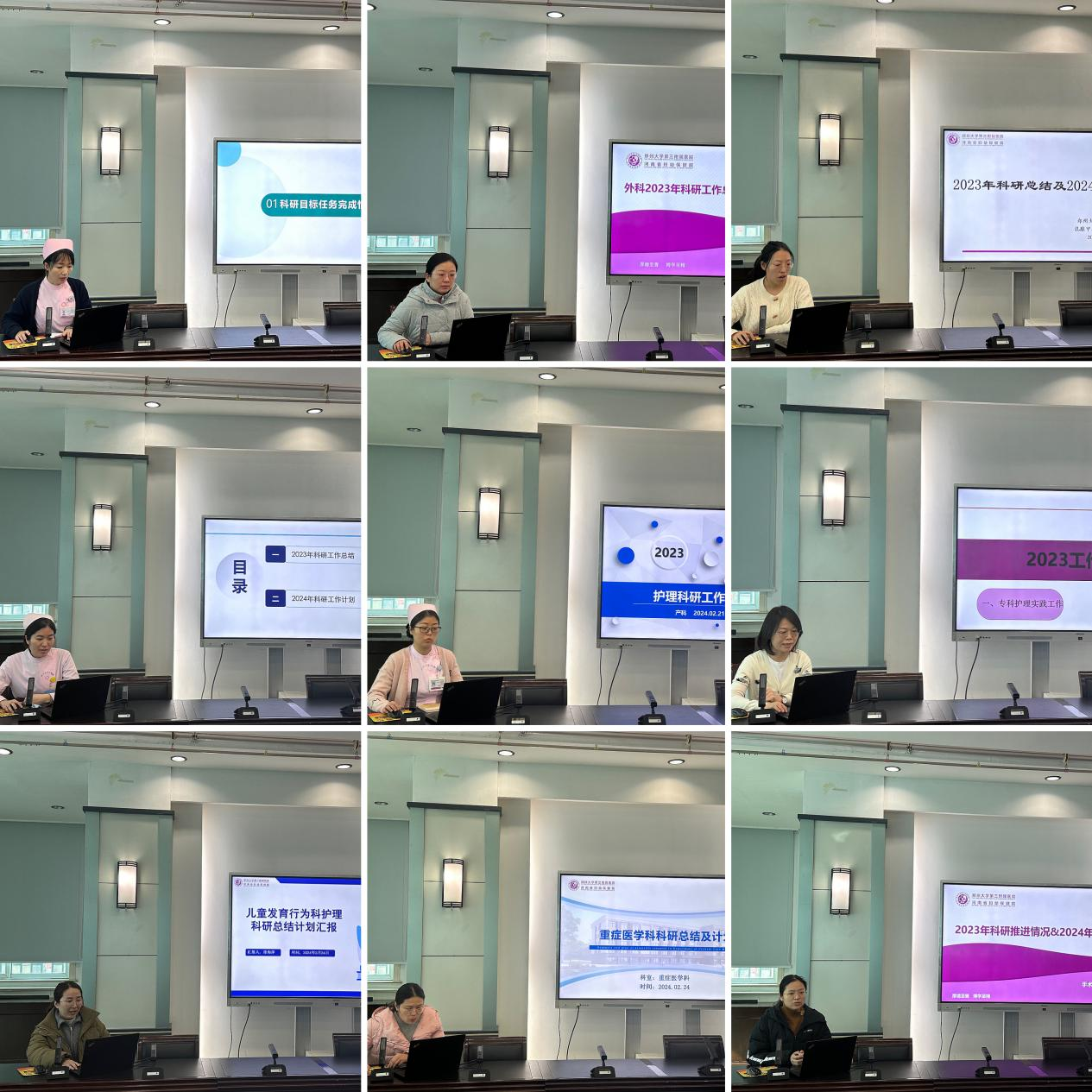 儿内科、儿外科、乳甲外科、妇科、产科、康复医学科、儿童发育行为科、重症医学科、手麻科、生殖医学科、门诊、急诊共12个大科依次进行2023年科研工作总结暨2024年工作计划汇报。各大科总结了2023年科研产出,寻找科室现存问题和发展困惑,制定整改策略,并对2024年人才培养、科研立项、科研创新等方面进行规划。各大科均对新一年的护理科研发展、学科建设充满信心。接下来张凤芝对科研护士的科研产出和医院护理重点学科建设目标任务进行汇报。根据科研护士产出情况,寄语科研护士继续努力,针对自己科研任务完成情况,充分发挥自己的科研能力,加快科研产出;同时希望各科室要充分发挥研究生学历护士的科研带头作用,带动科室护理人员共同参与科研,包括开展学术沙龙、文献分享,鼓励临床护士申请在职研究生学历以及科研项目立项等,积极开展临床护理科研工作,共同促进我院护理重点学科的发展。根据医院部署的重点学科任务,结合各大科护理人员职称及学历结构,护理部对2024年度科研任务进行分配,希望各大科积极协助推进医院护理重点学科发展,以高质量高标准完成2024年重点学科的科研任务。