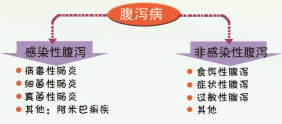 急性腹泻多见于肠道感染、食物中毒、急性局限性肠炎、出血性坏死性肠炎、肠型紫癜等,根据致病因子的性质分为两大亚型:痢疾样腹泻和水泻。痢疾样腹泻可有黏膜破坏,频频排出有脓血性粪便,并伴腹痛、里急后重;而水泻不含红细胞、脓细胞,不伴腹痛、里急后重。慢性腹泻起病缓慢,见于阿米巴痢疾、结核、血吸虫病、肿瘤等;集体食堂就餐人员成批发病且症状相同为食物中毒、流行性腹泻或传染病的流行。小肠炎性腹泻,腹泻后腹痛多不缓解;结肠炎性腹泻于腹泻后腹痛多可缓解。