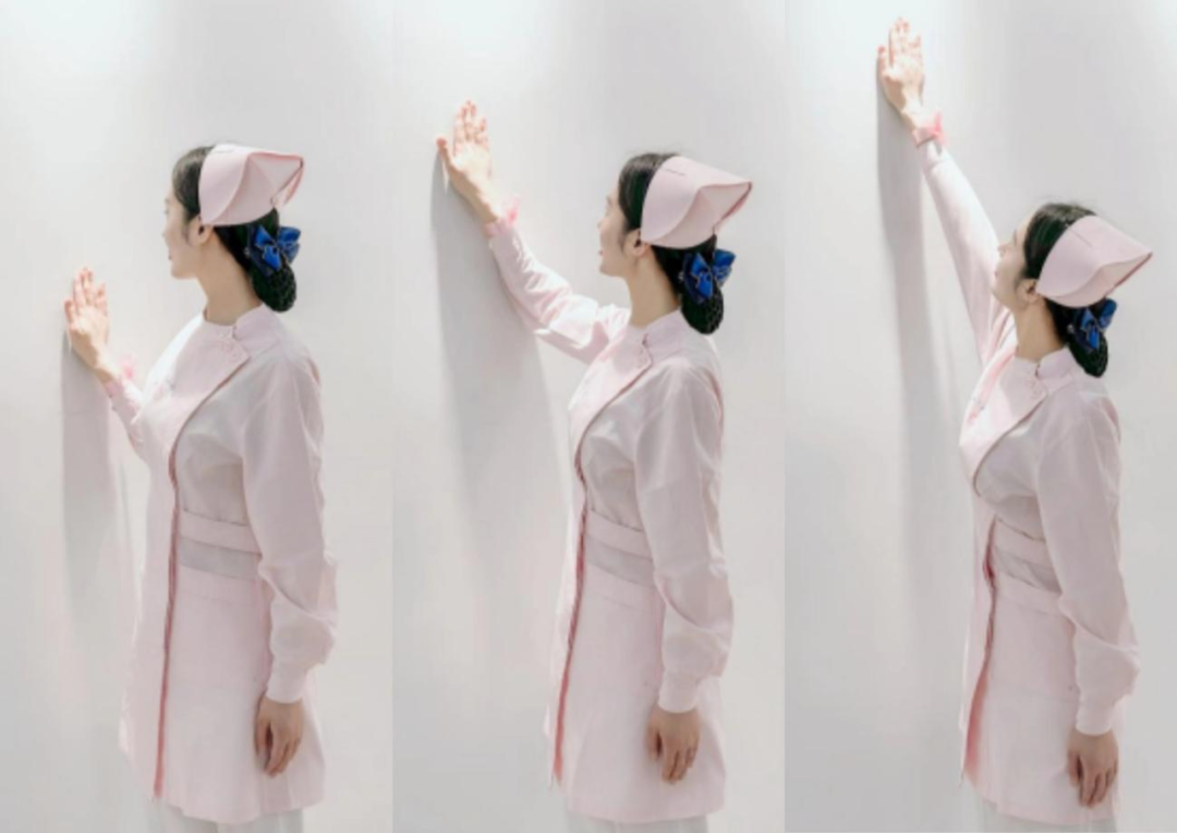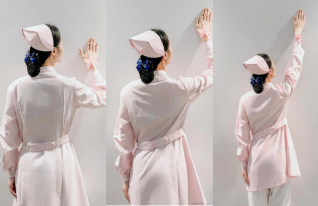 手指爬墙法之外展爬墙:(双脚分开,侧身对墙站直,将患肢于肩膀水平平伸出去,放在墙上向上爬,然后重复。每日标记高度,逐渐递增幅度直至患侧手指能高举过头)