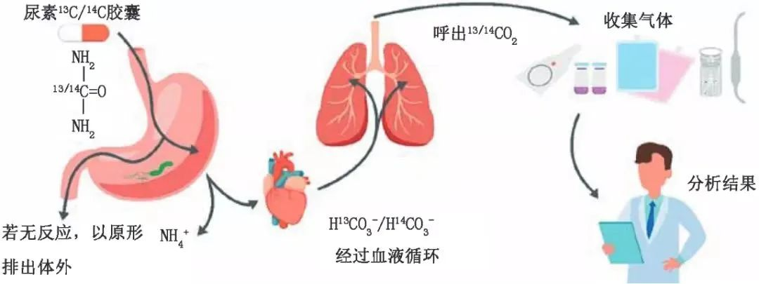 尿素呼气试验(UBT)是检测幽门螺杆菌感染的一种重要非侵入性方法,其原理是让患者口服被13C 或14C 标记的尿素,这时如果胃内存在幽门螺杆菌,它们就会像“饥饿的食客”一样,迅速分解这些尿素分子,释放出13CO2或14CO2。这些被标记的二氧化碳随后通过血液循环进入肺部,并随着呼吸排出体外。通过检测呼气中核素标记的CO2,即可判断是否存在幽门螺杆菌感染。