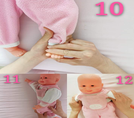握住宝宝双手,拇指放在宝宝手掌内,向上弯曲左臂肘关节,180度,屈曲,伸展,对侧同理,动作交替。
