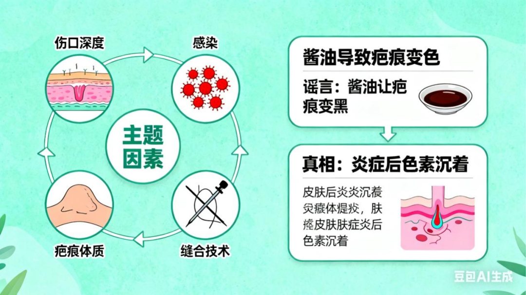疤痕的形成主要取决于:伤口深度、有无感染、个人体质(是否为疤痕体质)以及缝合技术。皮肤的颜色由黑色素决定,而酱油中的色素在消化道就被分解了,根本不会跑到伤口去“染色”。伤口愈合期间局部皮肤颜色变深,是炎症后的正常色素沉着,与食物颜色无关。