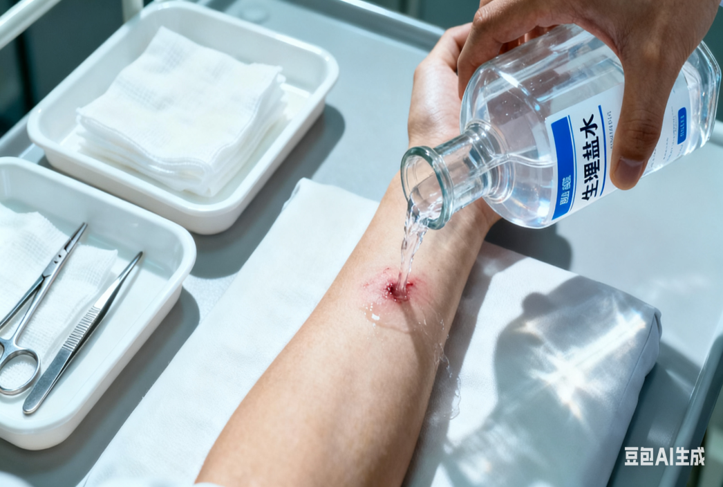 这是最关键的一步!请用生理盐水或流动的清水(如自来水)轻轻冲洗伤口,以去除表面的污物和细菌。如果周围皮肤较脏,可用棉签蘸取碘伏,以伤口为中心,由内向外螺旋式消毒。注意:避免使用酒精或碘酒直接刺激伤口,以免引起剧烈疼痛并破坏肉芽组织。待碘伏自然晾干。