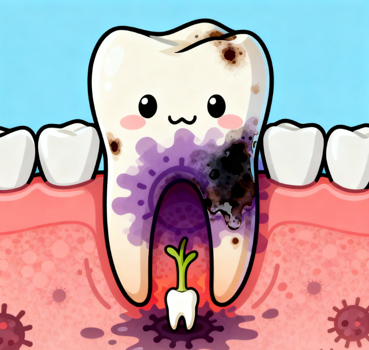 2. 摧毁恒牙“胚胎”: 乳牙的牙根下方,就是正在发育的恒牙胚。乳牙龋坏一旦进展到根尖,炎症会直接破坏恒牙胚,导致未来恒牙长出来就带斑点、形态异常,甚至无法正常萌出。