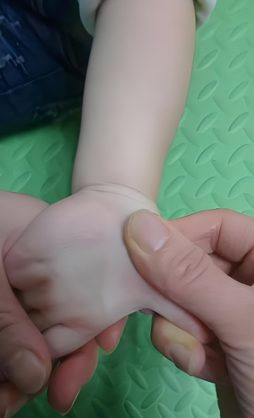 家长朋友们先别紧张,首先宝宝这种情况是拇指内收,其次让我们了解一下什么是拇指内收?拇指内收是指拇指在弯曲时呈内收状态,手张开时拇指不能主动外展。拇指内收分为生理性和病理性,生理性拇指内收常见于0-4月龄婴儿,多在4-5月龄后自然消失,逐渐能自主张开抓握物品,不会持续影响手部功能,牵拉时拇指可以轻松外展,无僵硬或明显阻力。病理性拇指内收持续超过6个月,被动牵拉时僵硬、阻力大,会造成抓物困难、精细动作障碍。