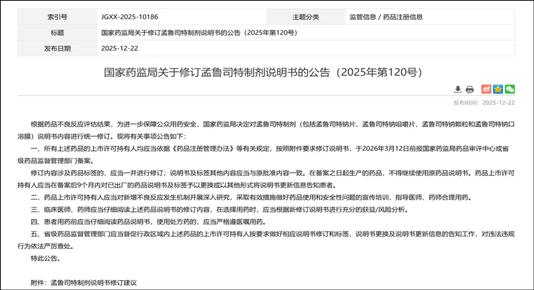 作为儿童过敏、哮喘的常用药,孟鲁司特钠一直是很多家长心中的安心之选。但最近几年,这款临床应用多年的老药却接连拉响安全警报——尤其是2025年12月,中国国家药品监督管理局正式发布关于修订孟鲁司特制剂说明书的公告,要求统一修订所有孟鲁司特制剂的说明书,在其中清晰标注该药可能引发神经精神不良反应的风险。