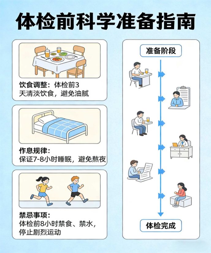 体检前需严格遵守空腹要求,抽血、腹部B超(肝、胆、胰、脾)检查需空腹8-12小时,建议前一晚8点后停止进食,可少量饮用白开水,严禁浓茶、咖啡、各类饮料及酒精。同时,体检前3天应保持规律作息,避免暴饮暴食,减少油腻、高糖、高盐食物摄入,不熬夜、不进行剧烈运动,防止干扰血脂、血糖、肝功能等指标检测。