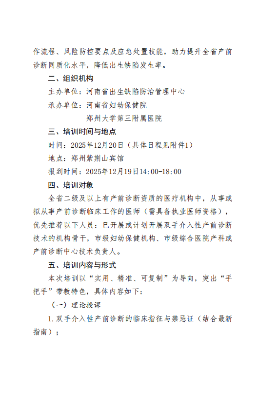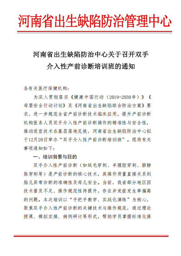河南省出生缺陷防治中心关于召开双手介入性产前诊断操作手把手培训班的通知