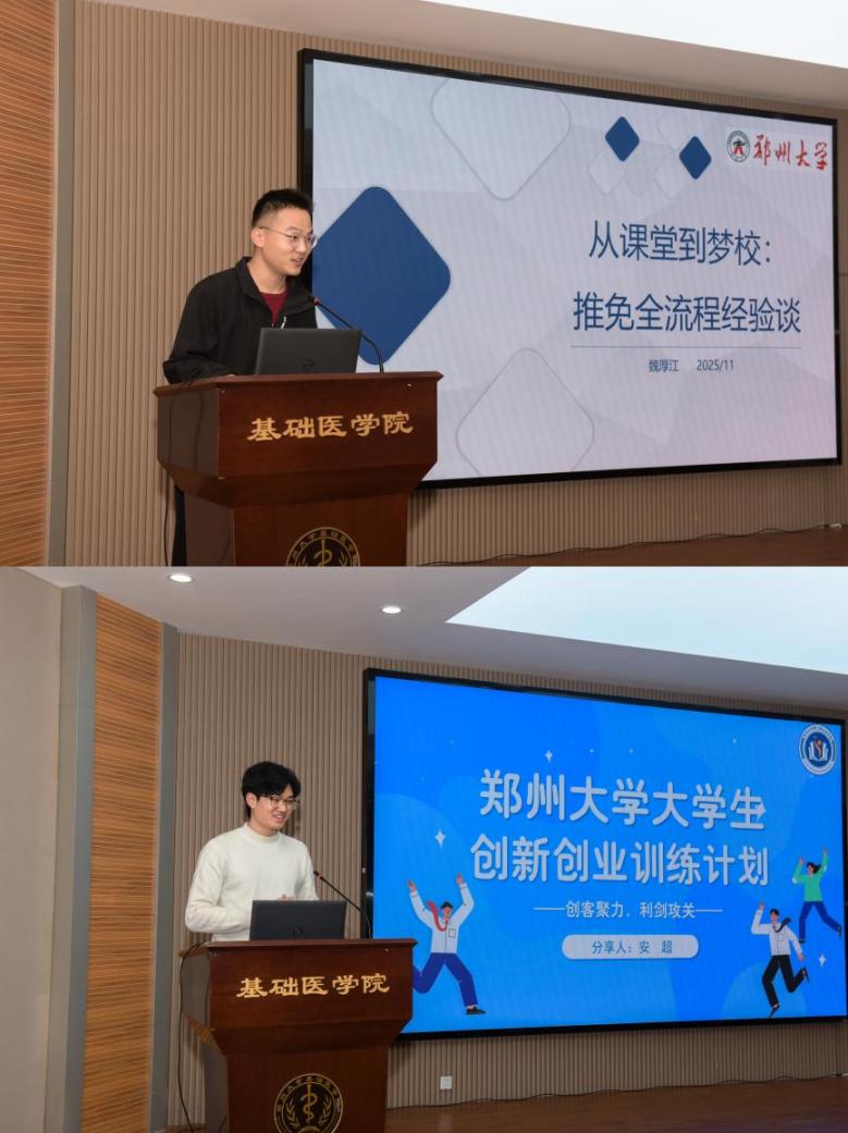 接下来,两位优秀的高年级学长为大家分享了学习经验。2021级儿科学魏厚江以“从课堂到梦校”复盘推免全流程,提醒学弟学妹“成绩是硬通货,科研是加分项,信息是决胜招”,早规划、重积累、善沟通,即可把“考研焦虑”转化为“保研主动”;2021级临床医学(5+3一体化儿科学)安超以“创客聚力,利剑攻关”为主题分享大创项目经验,简要介绍了大创项目三大类型、层次划分及申报流程,并结合医学生特点,强调其对科研能力与综合素养的提升作用,为新生提供清晰指引。两场干货分享点燃现场,使2025级新生今后的学习方向更明、动力更足。