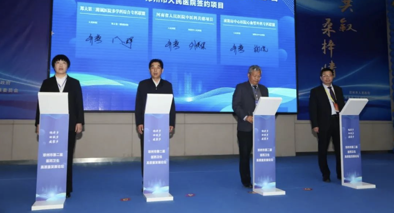 在邓州市第二届医药卫生高质量发展论坛上,周荣群代表郑大三附院与邓州市中心医院签订河南省妇幼专科联盟,与邓州市人民医院签订多学科综合专科联盟合作协议,与邓州市妇幼保健院签订河南省妇幼专科联盟。专家们分别与当地医院进行了技术帮扶、手拉手传帮带对接交流。
