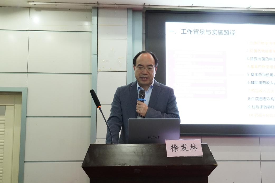 大会由药学部主任孙楠主持,副院长徐发林以《驻科药师工作模式实践与成效》为题作专项汇报。作为省级驻科药师试点单位,医院创新采用“1+4+n”驻科药师工作模式——以1支专业驻科药师团队为核心,聚焦“妇科、产科、儿内科、儿外科”四大妇幼特色专科,逐步实现n个全院科室服务覆盖,通过详实数据充分展现了该模式在提升临床合理用药水平上的显著成效,并明确了未来推进计划。