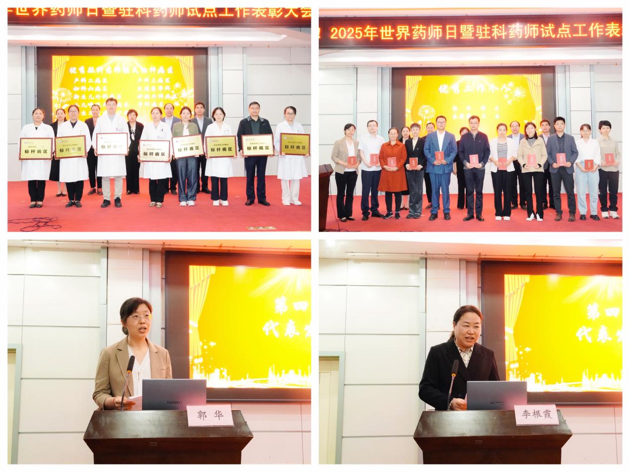 现场对9个“驻科药师工作模式合理用药标杆病区”、13名“优秀药学工作者”(含8名驻科药师、4名部门负责人、1名药学管理干部)进行隆重表彰。标杆病区代表产科主任李根霞、驻科药师代表郭华先后上台分享经验,深入传递“以患者健康为中心”的药学服务理念,为全院“医、药、护、技、管”的协作共进,提供了宝贵参考。