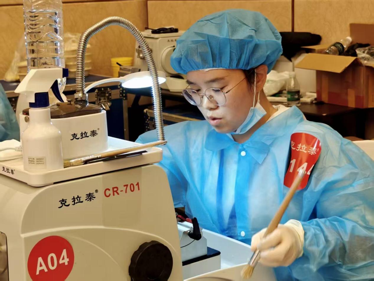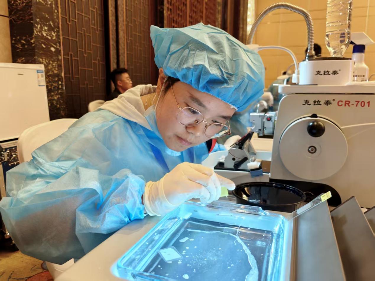 决赛现场,面对来自顶尖医疗机构的强劲对手,我院病理科刘艺璇在比赛中沉着冷静,精益求精,在石蜡制片操作的规范性、切片质量的精准度(包括切片厚度、平整度、完整性、透明度等)方面均表现出卓越水准,其制作的石蜡切片标本以超高的质量标准赢得了评审专家组的一致高度认可。