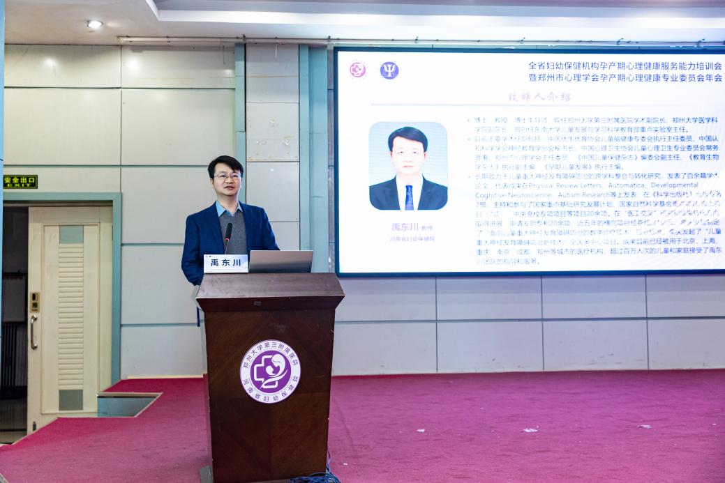 河南省妇幼保健院学术副院长、郑州市心理学会理事长禹东川教授致欢迎辞。他回顾了医院39年来的发展历程,介绍了医院在妇幼健康,特别是心理专科建设方面的成果,并强调孕产期心理健康是母婴安全与家庭幸福的重要保障。他表示,作为国家妇产区域医疗中心,医院将持续引领全省妇幼心理服务体系建设,推动孕产妇心理保健事业高质量发展。