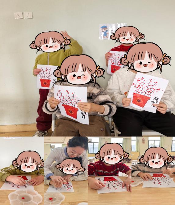 梅花福点画:孩子们用棉签蘸取红色颜料,在枝干上点出朵朵梅花,搭配印有“福”字的花盆模板。点画动作既锻炼了手眼协调能力,也让“梅开五福”的美好寓意在指尖流淌。