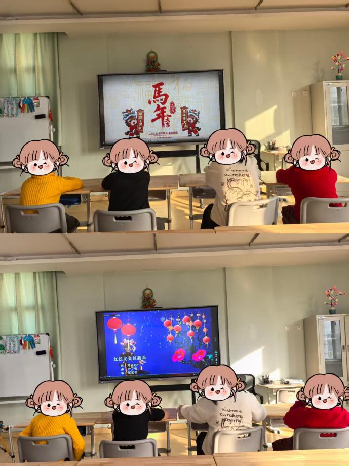 《红红火火过新年》的欢快旋律里,大屏幕滚动着马年主题动画。孩子们跟着节奏轻轻摇摆,有的孩子主动举起小手,指着屏幕上的“马年大吉”图案咿呀表达,眼神里满是兴奋与好奇。