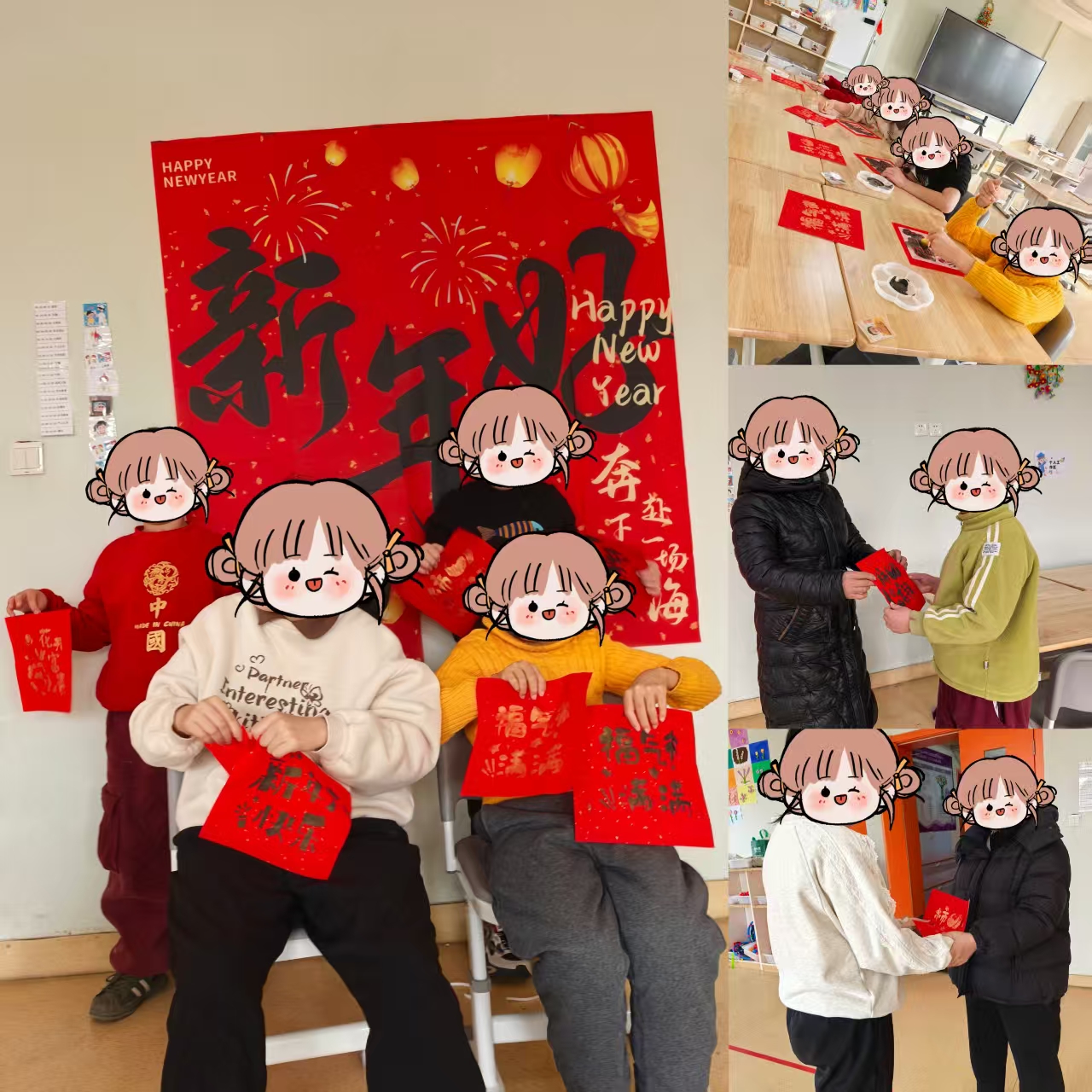 福字拓印:在老师的辅助下,孩子们用海绵拓印出“福气满满”的红色福字,将传统年俗融入趣味创作。