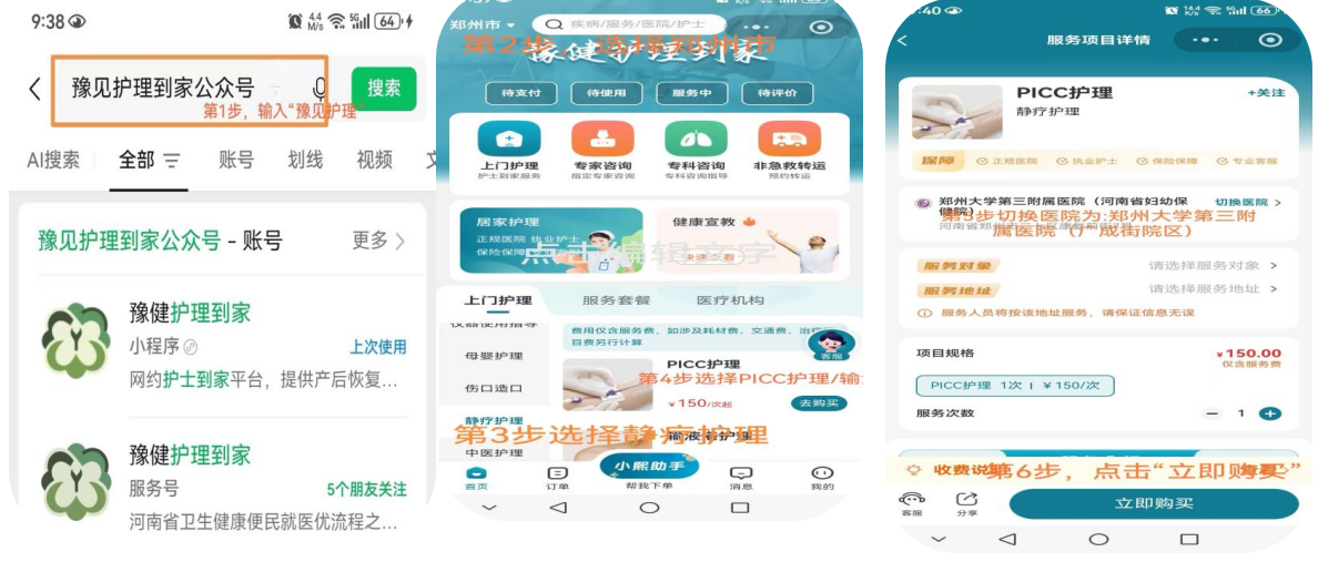 豫健护理预约:微信搜索“豫健护理”小程序,点选进去后按照下图指示依次进行: